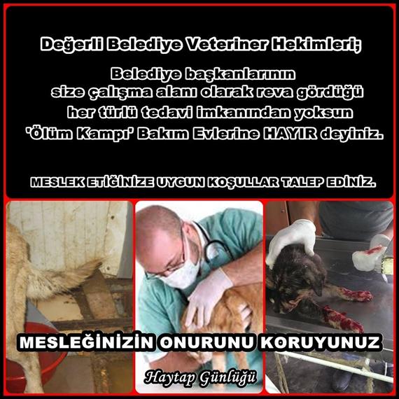 Lütfen aşağıda ki görseli tanıdığınız tüm belediye veteriner hekimlerine, veteriner hekim odalarına, fakültelere, özel veteriner hekim kliniklerine YOLLAYINIZ. Biliyorsunuz, "Belediye bakım evleri Veteriner hekimler yönetiminde adeta birer ölüm, açlık ve hastalık kampı" halinde. Bu arada Antalya, Osmaniye, Erzurum, Rize, Safranbolu, Antakya gibi bazı illerde "duyarlı ve etik duruşu olan bir tek veteriner hekimin bile hayvanlar için EN İYİ YAŞAM KOŞULLARINI oluşturduğunu da" görmekteyiz. Bu iyi örnekleri görerek, bir umut, kez de bu veteriner hekimlere temelde ağzı dili olmayan hayvanlara şifa dağıtması nedeni ile EN KUTSAL mesleklerden olan VETERİNER HEKİMLİK MESLEĞİNİN ONURUNU korumaları için çağrıda bulunmak istiyoruz. Bu çağrımız bir tek veteriner hekimin yüreğine bile ulaşsa, o şehir kurtulmuş olacak. Lütfen veteriner hekimlere SESLENELİM, hayvanlarımız adına vekaleten, kendi adımıza asaleten... Selam ve sevgilerimle..