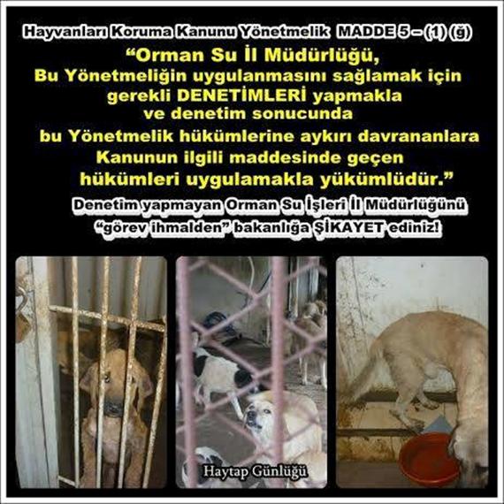 Orman Su İşleri Müdürlükleri görevlileri, gerek kötü koşullarda ki barınaklar ve gerekse hayvanlara zulüm ve işkence şikayetlerimizi denetlerken, sadece gözle !! bakıp, hiç bir yasa ve yönetmelik maddesini kriter almadan, "Burası iyi görünüyor" veya "hayvanın durumu da çok kötü değilmiş" gibi, devlet ciddiyetine yakışmayan üstünkörü denetim yapmakta ve rapor hazırlamaktadırlar. Hayvanları Koruma Kanunu uygulayıcısı olan mensup oldukları bakanlığın da saygınlığına zarar vermektedirler. Onların bu umursamaz davranışı ise belediyelere ve hayvan düşmanlarına cesaret vermektedir. Denetim yapmayan veya gayri ciddi denetim yapan görevlileri BAKANLIĞA şikayet edelim ki hizaya gelsinler, denetimleri KEYFE ve GÖZLERİNE göre değil, yasa maddelerine göre yapılacağını öğrensinler. Hem bakanlığa örnek yazı ve hem de gideceği mail adresleri aşağıda hazır. Durumunuza uyarlayın, somut olaylar varsa onları da ekleyin ve SORUŞTURMA isteyin. Devlet kurumlarına yasal görevlerini YAPTIRTMAYA da gayret etmeliyiz. Biz baskı yapmazsak onlar YATARLAR, masa başında mesai doldururlar veya kerhen gözleri ile !! denetim yap MIŞ gibi olurlar. Nesrin Çıtırık/ HAYTAP Başkanı.
